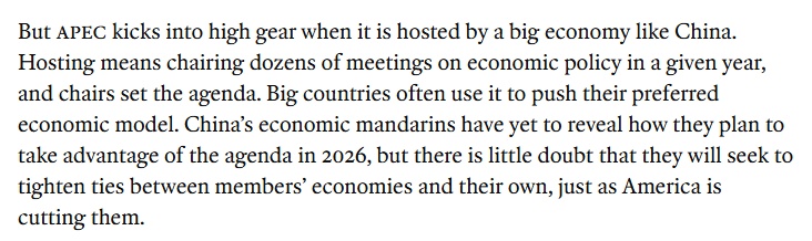 文章指出,2025年,中国与东盟正式签署自贸区3.0版更新协议。亚太经合组织(APEC)第33次非正式峰会将于2026年底在中国举行,占世界经济总量五分之三的成员国代表将在中国聚会。在当前形势和国际经济不确定性背景下,中国积极发展更加开放的经济合作,采取与美国作为经济伙伴的立场完全不同。