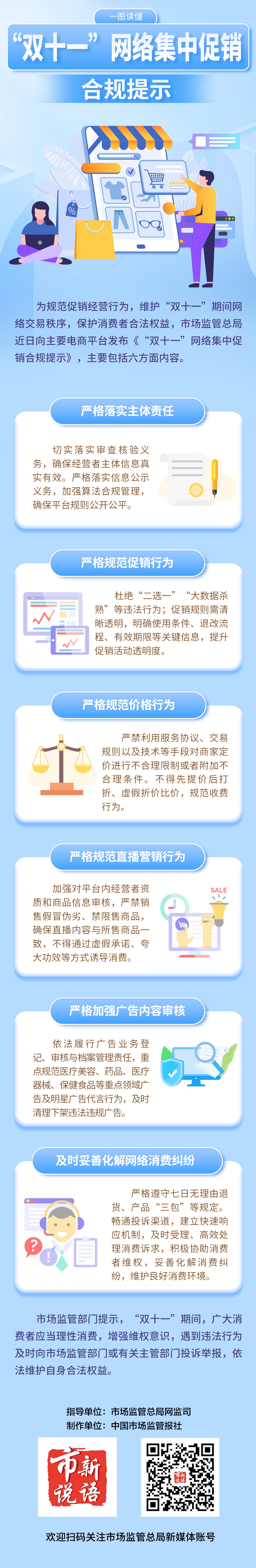 国家市场监管总局近日向各大电商平台发布《“双十一”网络集中促销合规提示》,旨在规范促销操作,维护“双十一”期间网络交易秩序,保护消费者合法权益。 “线索”主要有六个方面。一是严格履行主体责任。我们严格遵守相关法律法规,切实履行审核核实义务,确保经营者信息真实有效。我们将严格履行信息披露义务,加强算法合规控制,确保平台规则公开、公平。二是严格规范活动推广主体。杜绝“二选一”、“大数据删除”等违法行为。为提高促销活动的透明度,促销活动l 规则清晰透明,重点关注满减、优惠券、预售、保价等关键环节,明确使用条款、退换货流程、有效期等重要信息。三是严格规范价格行为。我们充分尊重商户的独立交易权利,严禁利用服务协议、交易规则、技术或其他手段不合理限制交易价格或附加不合理条件。不得先涨价后打折或者进行虚假折扣比较。切实落实《网络商务平台计费行为合规指引》要求,规范计费行为。四是严格规范直播营销行为。我们将加强对平台运营商评级和产品信息的审核,并定期验证和更新。我们会l 重点抓好直播产品质量管控,严禁销售假冒伪劣产品、违禁品、限用品,保证直播内容与在售产品一致,避免以虚假承诺、夸大效果诱导消费。五要加强对广告内容的严格把控。依法履行广告公司登记、审查和档案管理职责,推动医疗美容、药品、医疗器械、保健食品等重要领域拓展。重点规范明星广告和广告赞助,迅速下架违法广告。六是快速妥善解决网络消费纠纷。我们将严格遵守7天无理由退货、产品“三包”等规定,不会拒绝遵守售后法律义务。畅通投诉渠道,建立快速反应机制,及时受理、高效处理消费者投诉,积极帮助保护消费者权益,妥善化解消费纠纷,维护良好的消费环境。市场监管部门提醒,“双管齐下”期间,消费者应理性消费,增强维权意识,遇到违法行为,应及时向市场监管部门或有关主管部门提出投诉,依法维护自身合法权益。 上一篇:“小工单”背后隐藏着怎样的“智能制造”密码 下一篇:没有了